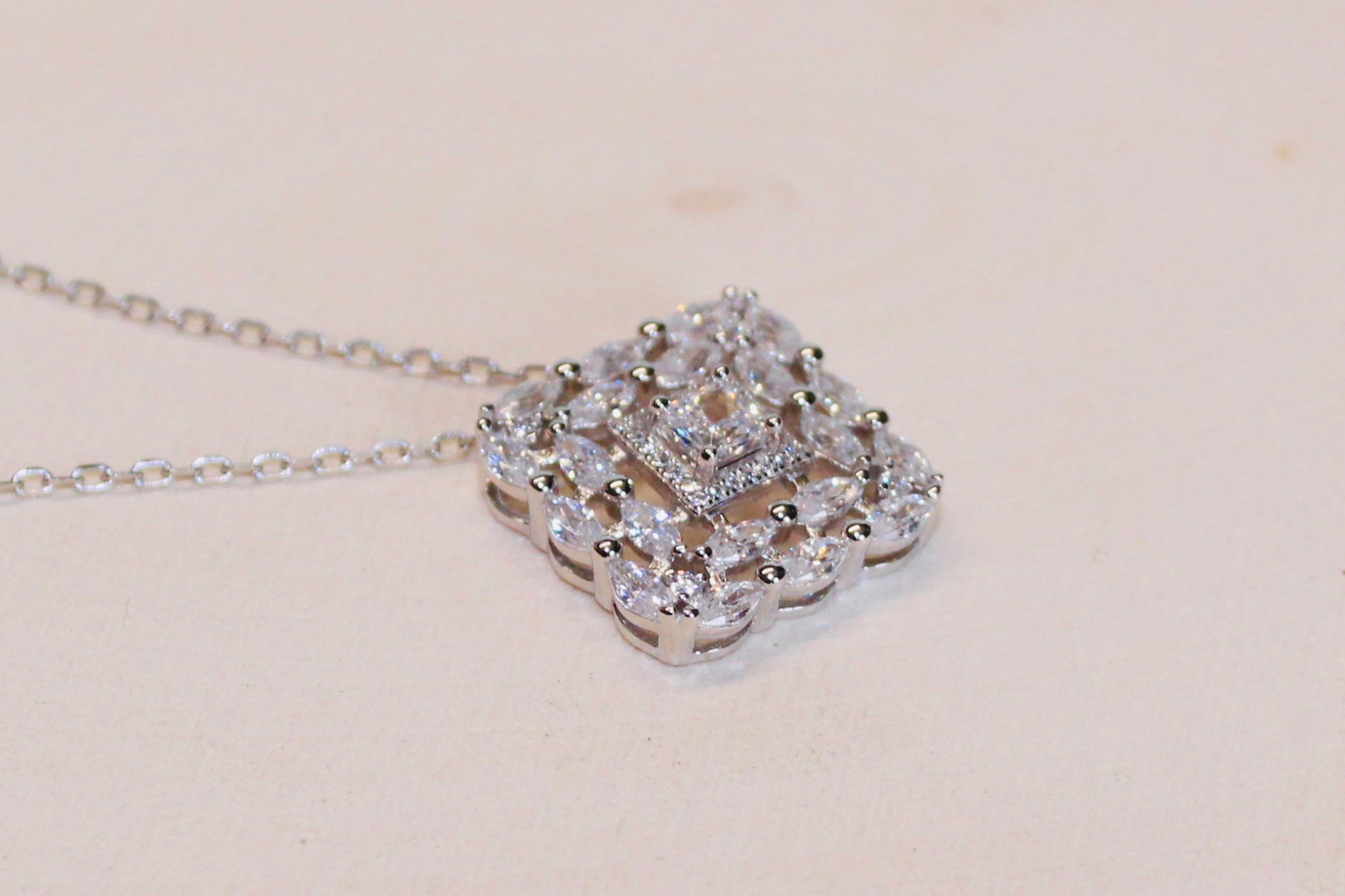 Collana in argento 925 con pendente quadrato, impreziosito da zirconia cubica taglio carré e marquise. Un gioiello elegante e luminoso, dal design equilibrato, pensato per esaltare il décolleté con discreta raffinatezza. Indossala da sola o in abbinata agli orecchini Cléa per una parure armoniosa e senza tempo. Misura regolabile da 39cm a 44cm