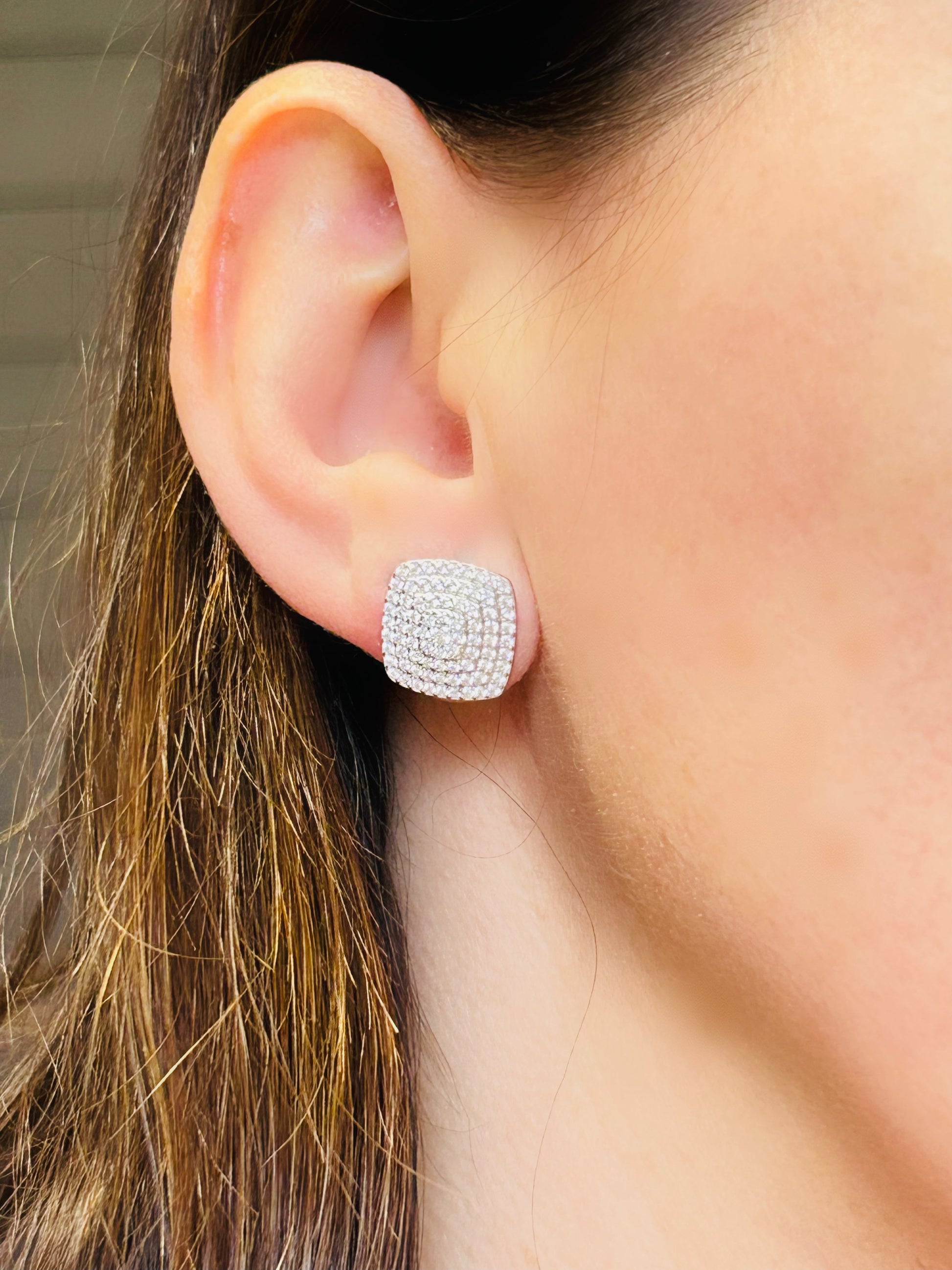 Orecchini in argento 925 con zirconia bianchi incastonati a pavé, dalla forma quadrata, morbida, elegante e leggermente bombata. Un design luminoso e raffinato, pensato per valorizzare il viso con discrezione ma carattere. Disponibile anche la collana coordinata Aurea.