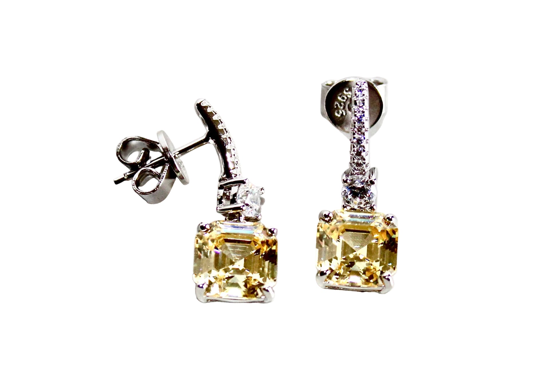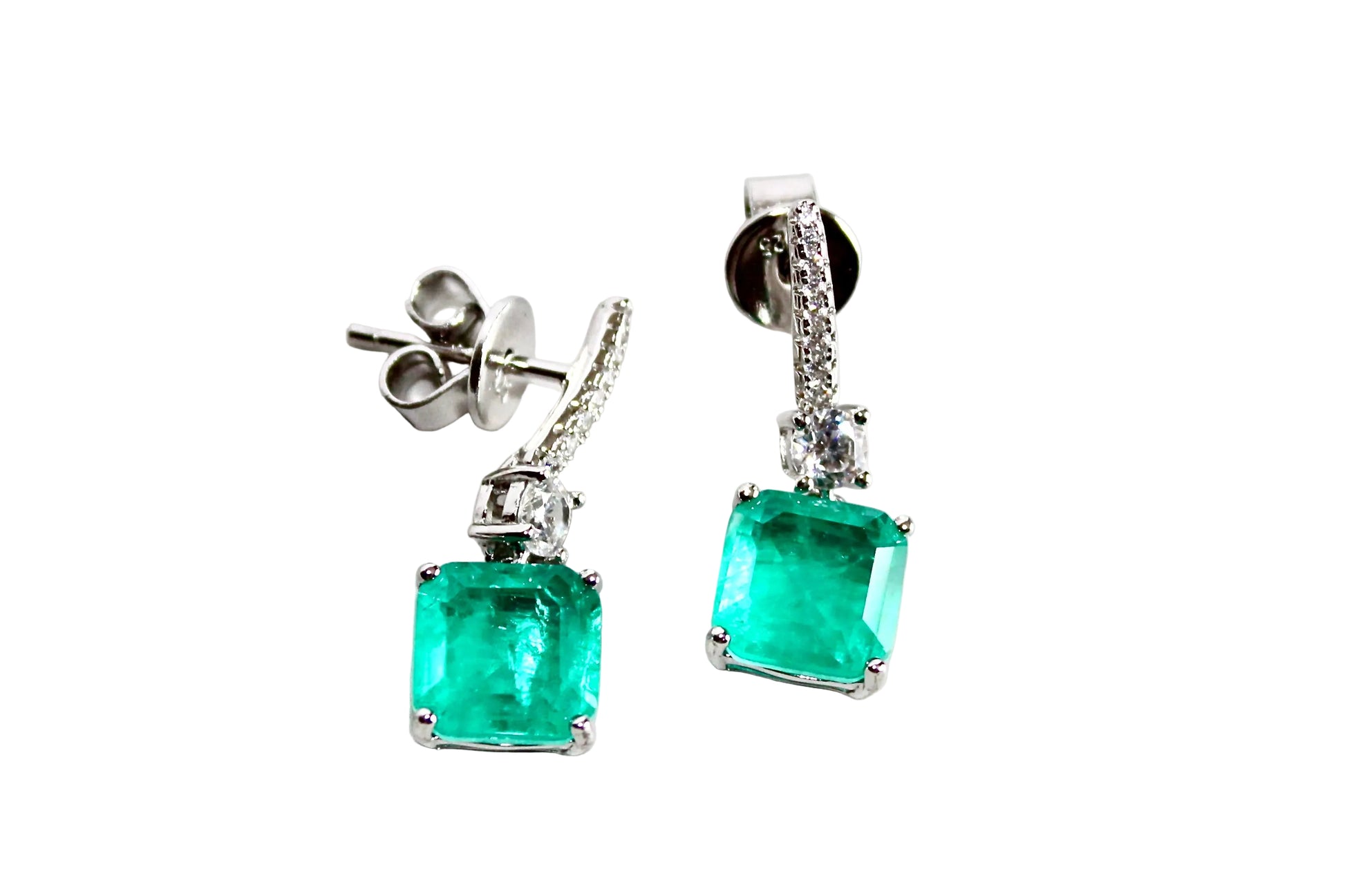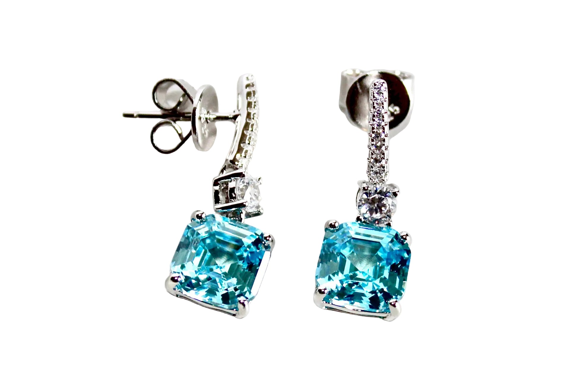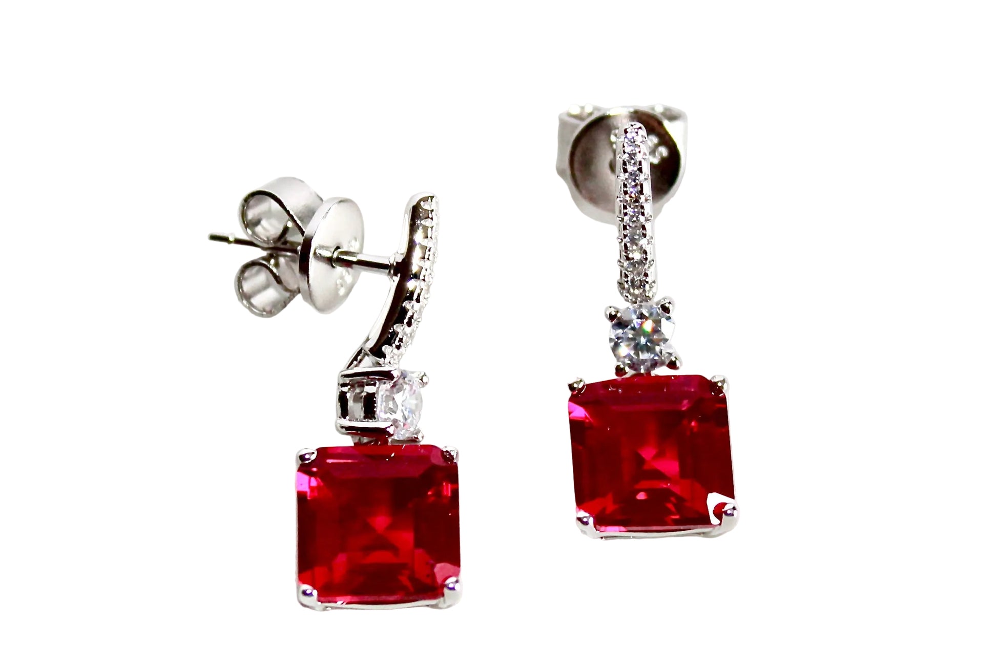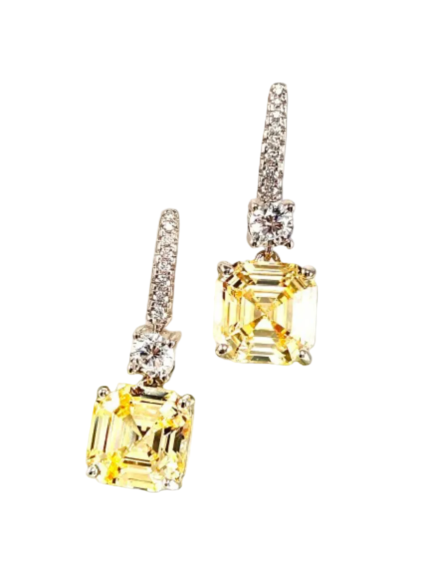 Questi orecchini pendenti uniscono la luminosità dei Quarzi idrotermali lab‑grown alla raffinatezza dell’argento 925 con doppia rodiatura, che garantisce una brillantezza più resistente e una finitura di qualità superiore. Le pietre principali, taglio quadrato e colore intenso, sono affiancate da una barretta impreziosita da otto zirconi cubici, scelti per aggiungere un tocco di luce fine e uniforme.