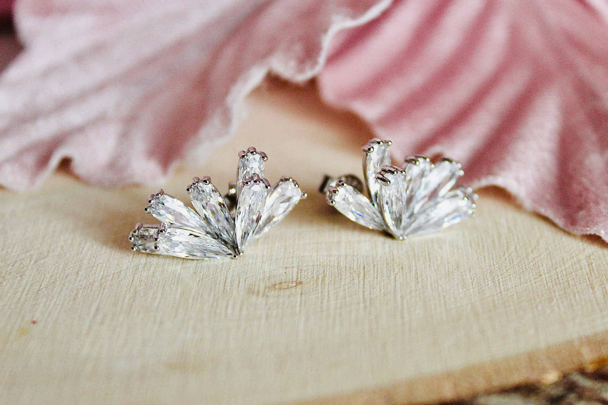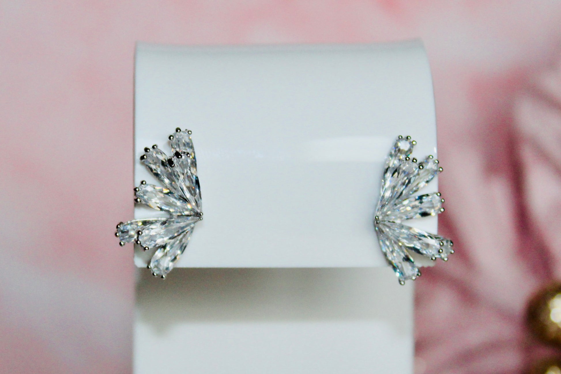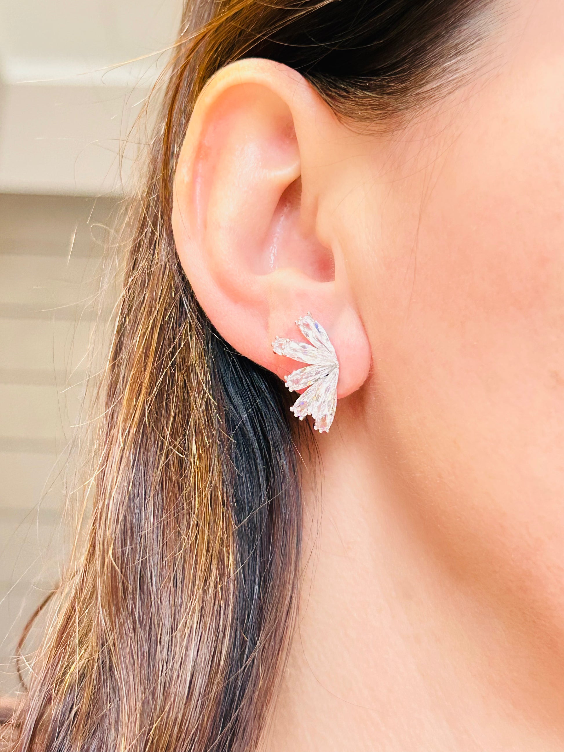 Splendidi orecchini a lobo dal design a ventaglio con zirconia cubica taglio marquise disposti a raggiera per creare un effetto luminoso, armonioso e tridimensionale. Realizzati in argento 925 valorizzano il viso con eleganza e glamour.