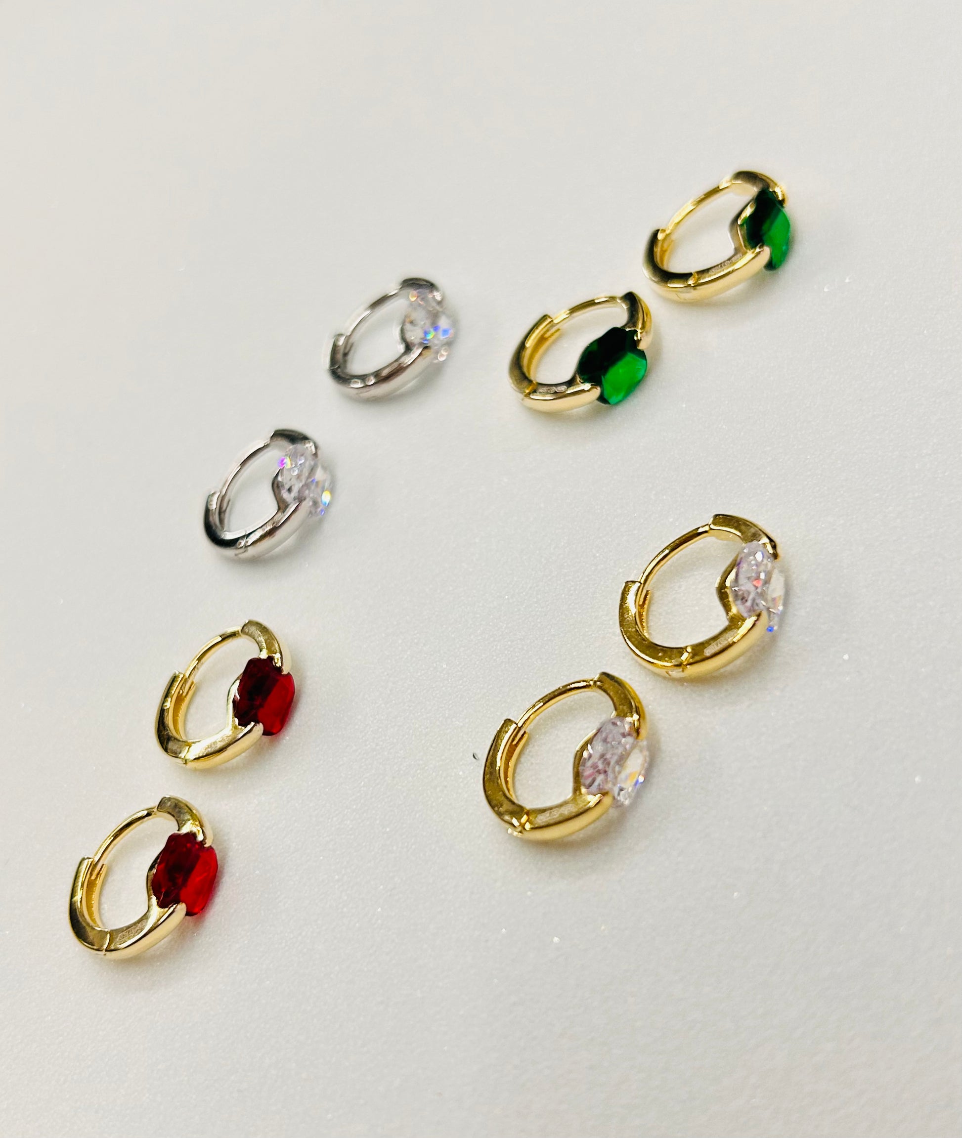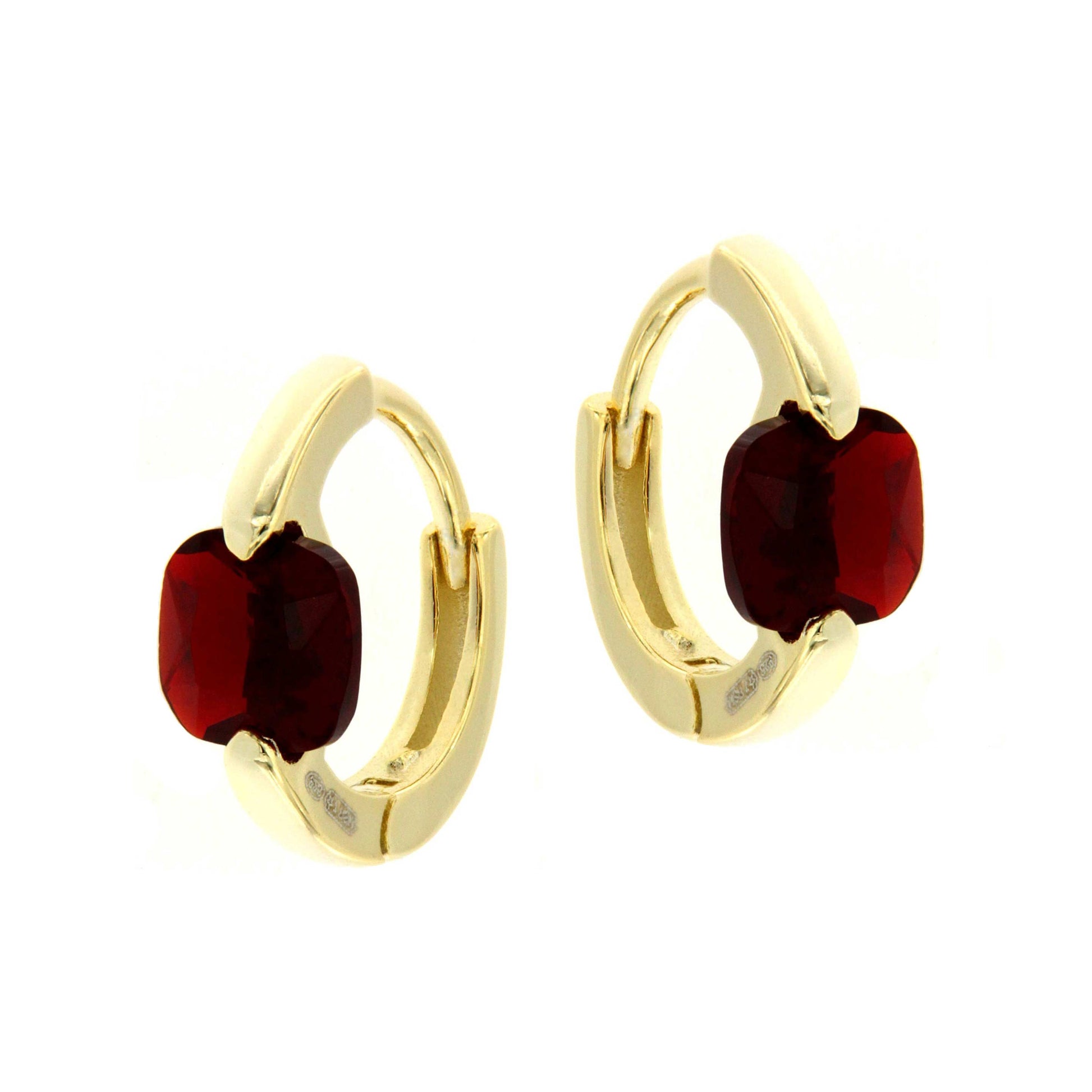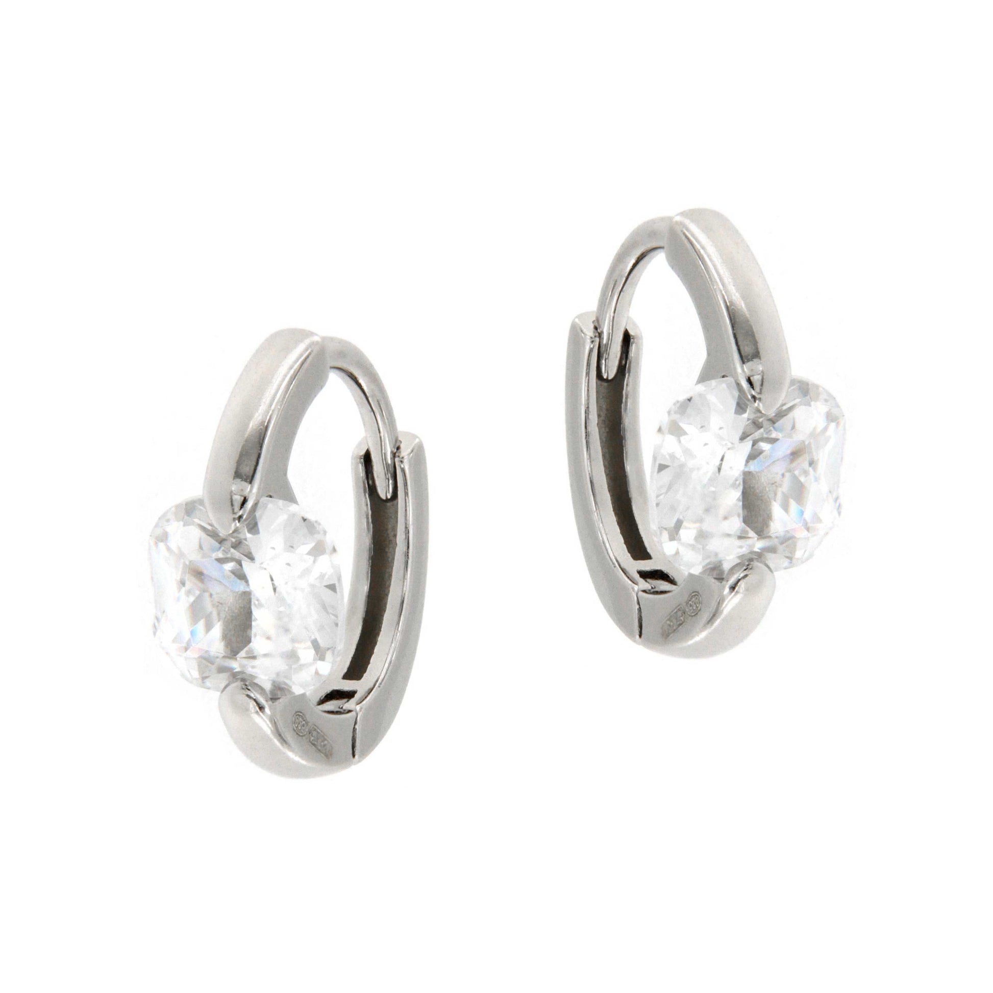 Eleganti orecchini a cerchio da 13 mm con zirconi quadrati centrali con montatura a scomparsa. Delicati ma di effetto, un punto luce che non passa inosservato