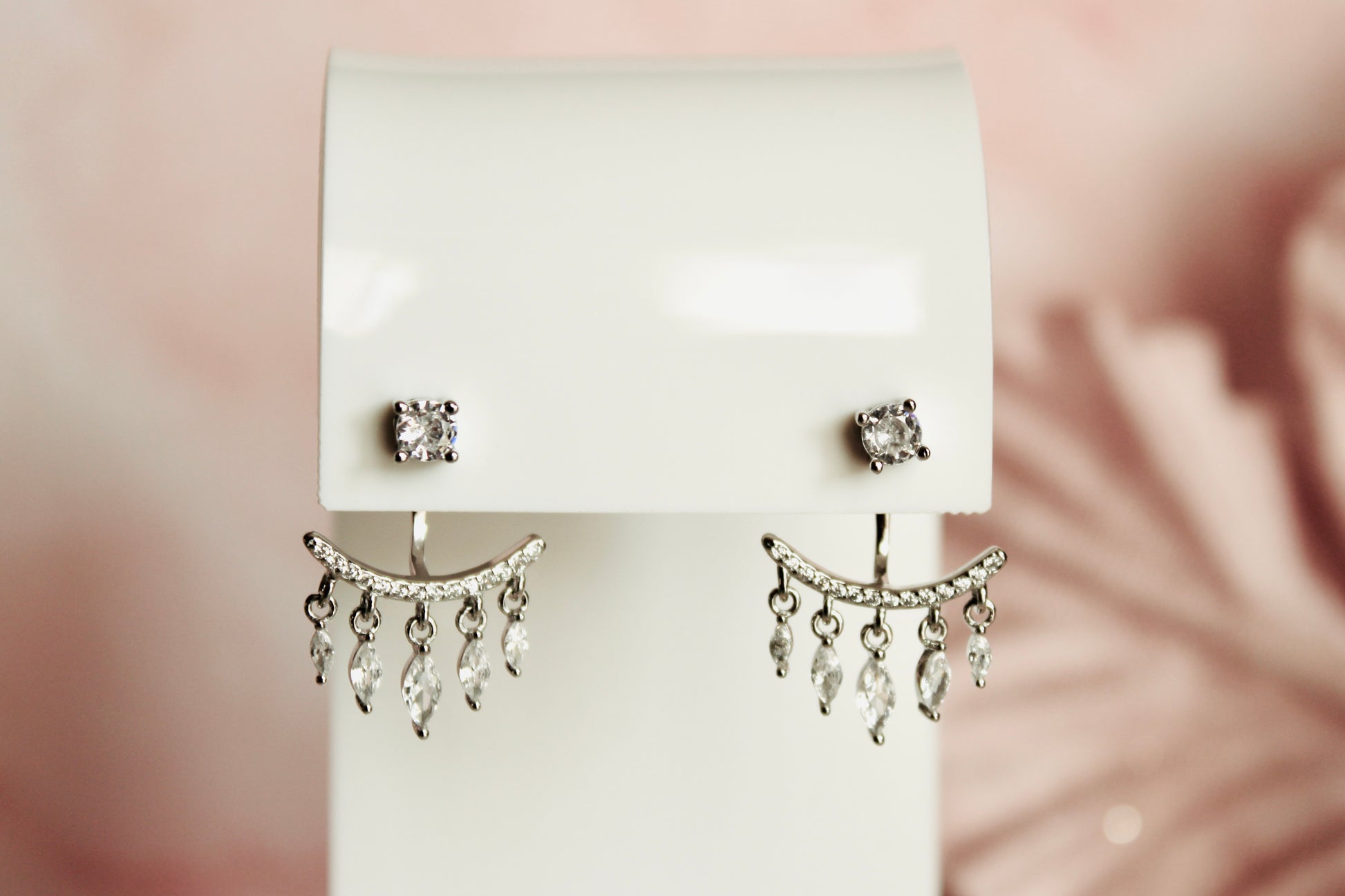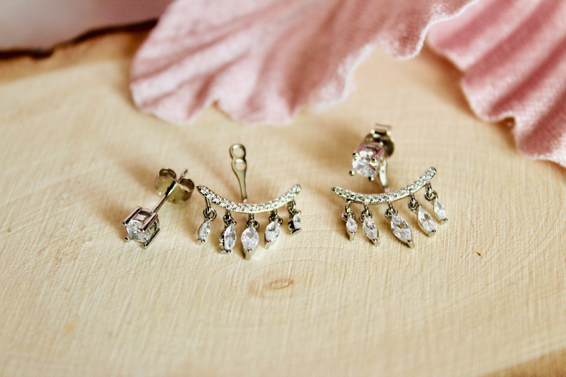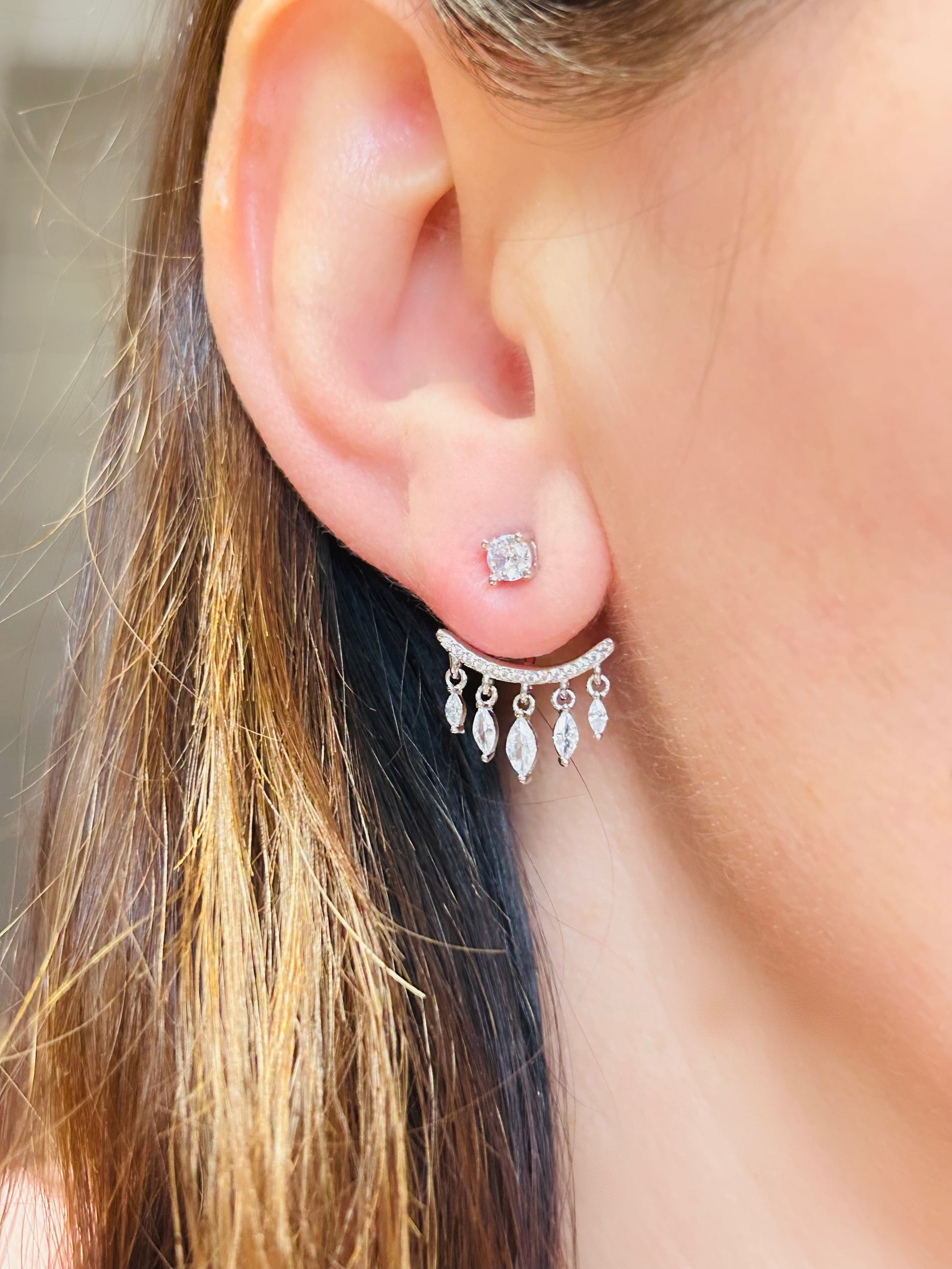 Orecchini in argento 925 con zirconia bianca, dal design modular e luminoso. Il set è composto da due elementi, pensati per essere indossati singolarmente o combinati. Come punto luce classico, essenziale d elegante oppure con pendente posteriore impreziosito da zirconia pendente per un effetto delicato e sofisticato. Un gioiello trasformabile che accompagna con grazia ogni momento della giornata.